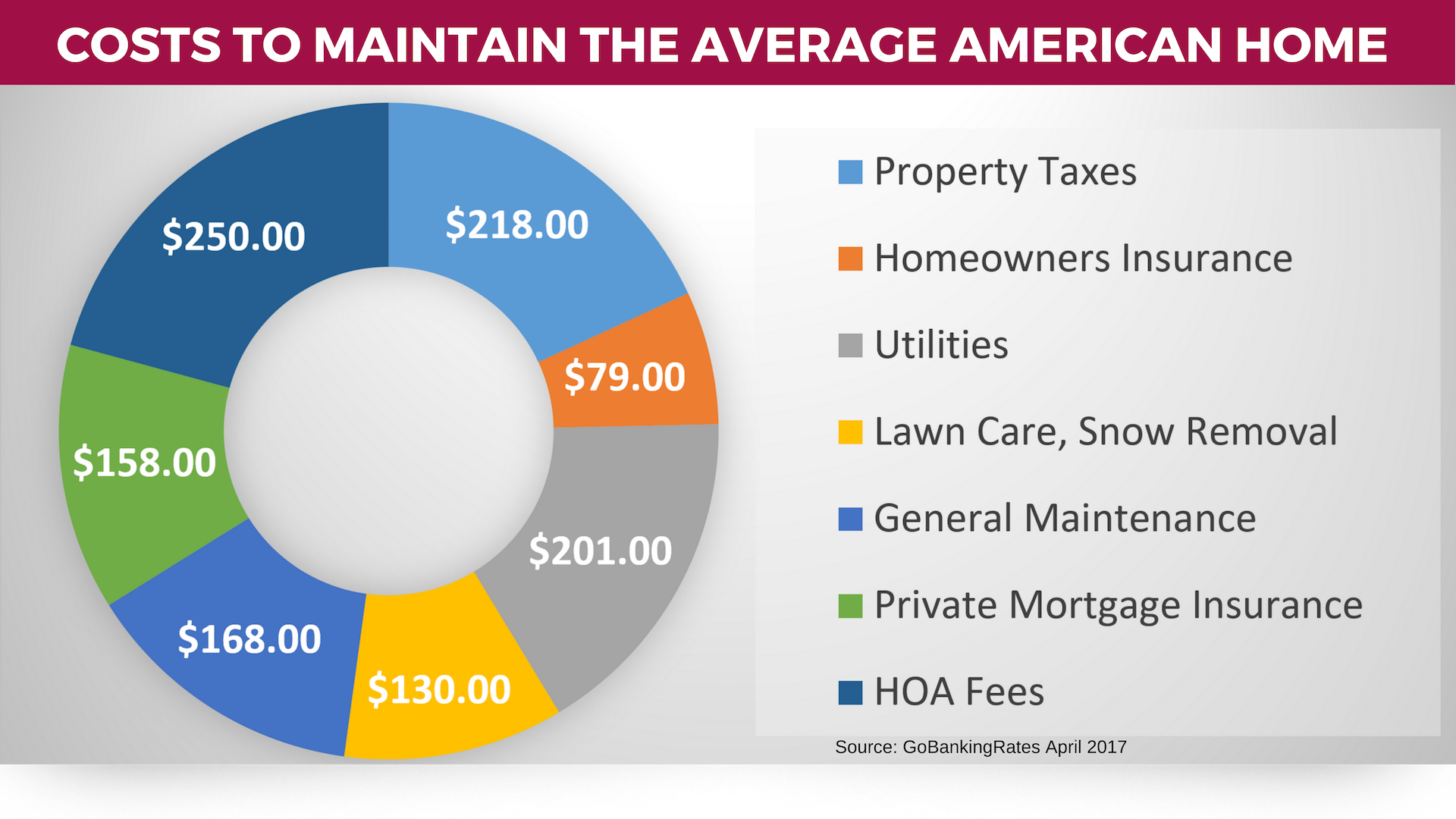 According to financial experts for GoBankingRate, "owning a home doesn’t end with your mortgage loan... you must add maintenance into your budget, which might cost you an additional $1,204 a month, or $14,448 annually" as a result of seven recurring monthly costs.